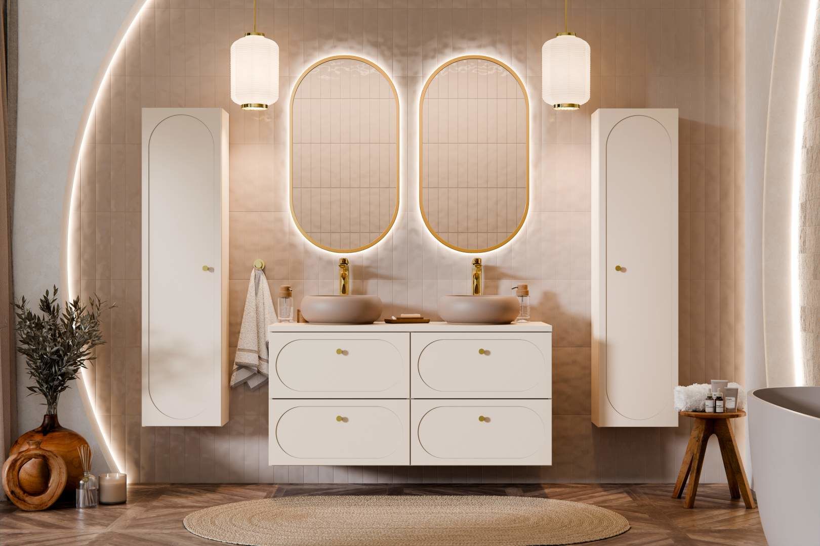 Kolekce Dona je moderní reinterpretací klasického stylu, inspirovaného jemností. Jemné čela se zaobleným frézováním dodávají kolekci jedinečný charakter a lehkost. Dekor Pískově béžový použitý v kolekci je variací na kašmírové barvy, které dominují trendům v interiérovém designu a vnášejí do interiérů teplo a harmonii. Zlaté kovové úchytky dotvářejí vzhled, zdůrazňují eleganci a dodávají mu vytříbený vzhled. Díky systému tlumeného dovírání je používání skříněk a zásuvek mimořádně pohodlné a klade důraz na detail při každodenním používání. Skříňky pod umyvadlo o hloubce 46 cm nabízejí dostatek úložného prostoru a zároveň zůstávají praktickým řešením pro každou koupelnu. Kolekce je vyrobena z odolných materiálů, jako je MDF a laminovaná deska, což zajišťuje dlouhotrvající estetiku.